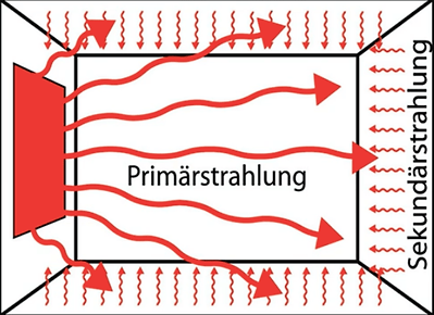 Die Strahlung erwärmt primär Oberflächen wie Wände und Möbel, die dann sekundär Wärme abgeben. Dies führt zu einer gleichmäßigen Raumtemperatur ohne starke Luftzirkulation.