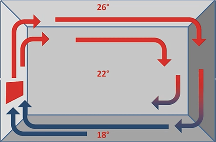 Die ausgesendeten Wärmewellen verteilen sich gleichmäßig im Raum und erwärmen die festen Gegenstände – Wände, Möbel, Fußboden. Diese geben die Wärme wieder als Sekundärstrahlung ab. Somit hat man im Raum eine gleichmäßige Temperaturverteilung von der Decke bis zum Fußboden.