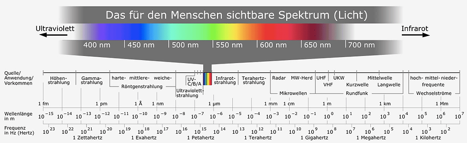 Der Bereich, den wir als Menschen sehen können, beschränkt sich jedoch auf Wellenlängen zwischen 380 und 780 Nanometer.